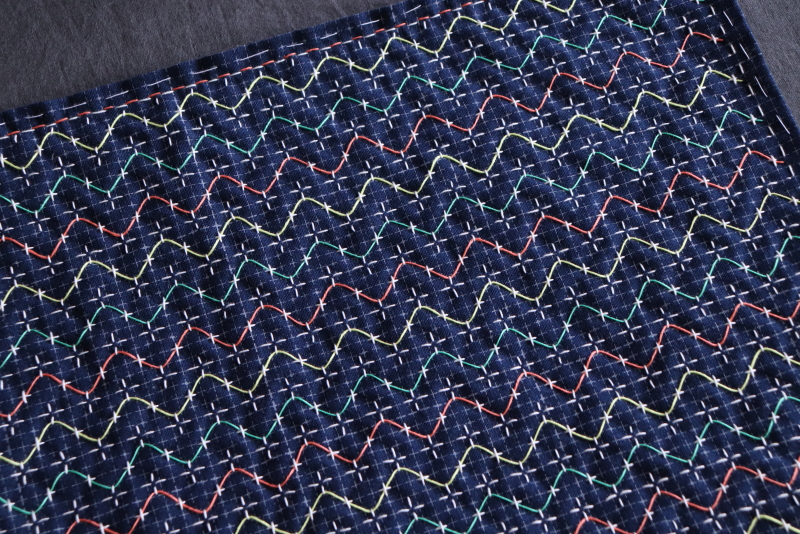 あじさい刺しを途中まで試してみたんですが、色がごちゃごちゃしてきたので、思い切って糸を間引き。横波だけ残しました。